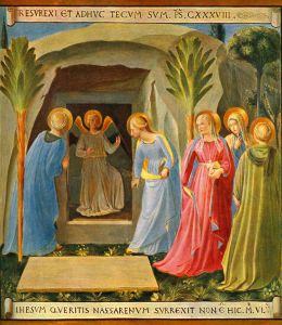 Dopo il sabato, all’alba del primo giorno della settimana, Maria di Màgdala e l’altra Maria andarono a visitare la tomba. (…) L’angelo disse alle donne: «Voi non abbiate paura! So che cercate Gesù, il crocifisso. Non è qui. È risorto, infatti, come aveva detto (…)».All’alba, alle prime luci, quasi clandestinamente, due donne si recano alla tomba nel giardino.