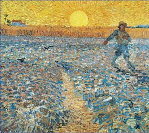 Nel dipinto Il Seminatore (1888), Van Gogh scambia i colori: il cielo è dorato come la messe matura e la terra che accoglie i semi ha il blu del cielo. Ogni volta che un contadino semina, il cielo viene sulla terra. E il seminatore volge le spalle al tramonto per dirigersi verso un’alba nuova. Nel disorientamento che proviamo mentre ci chiediamo dove siamo e quale direzione prendere, nella terra troviamo la speranza per il domani. Questo senso di fiducia nel futuro si amplifica, da un lato, nella gratitudine per il Creato ma, dall’altro, viene adombrato dalla preoccupazione crescente per uno sfruttamento che mette a rischio l’agricoltura e la vita delle persone.
